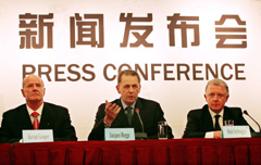 IOC President Jacques Rogge (C), flanked by IOC Press Commission Chairman Kevan Gosper (L) and