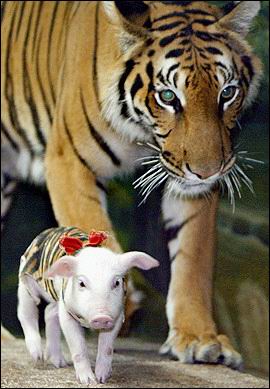 The odd couple : A tigress walks along a piglet at the Sri Racha tiger zoo, the world's largest tiger breeding centre in Thailand, as it reopens following a bird flu outbreak. [AFP]