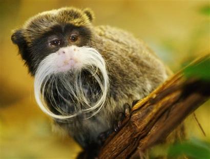 A Emperor tamarin (Saguinus imperator subgrisescens) sits on a branch in his enclosure in the Zurich, Switzerland, zoo, Wednesday, Nov. 17, 2004. The bearded Emperor tamarins live in tropical forests of Brazil, Peru, and Bolivia. [AP]