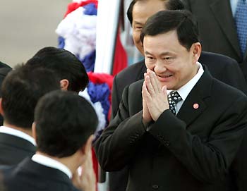 Thailand's Prime Minister Thaksin Shinawatra greets staff upon his arrival at Vientiane's Wattay international airport on the eve of the 10th Association of Southeast Asian Nations (ASEAN) Summit in Laos, on November 28, 2004. The ASEAN Summit goes from November 29-30 in the Laotian capital.[Reuters]