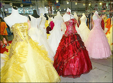 Wedding dresses are displayed at a wedding fair in Shanghai, July 2004. Modern Chinese couples spend 1,000 times more than their parents' generation on lavish weddings and other expenses linked to starting a family, state media reported. [AFP]
