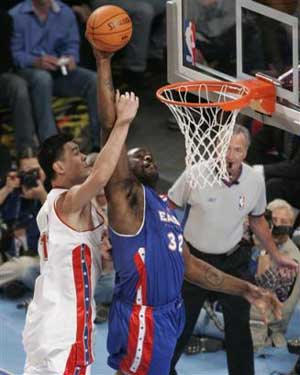 West center Yao Ming, left, trys to defend as Shaquille O'Neal goes for a slam during the first quarter of the NBA All Star game in Denver, Sunday, Feb. 20, 2005. The east won the match 125-115. [AP]