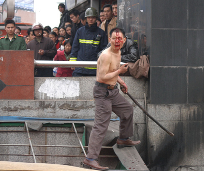 A Chinese migrant worker attempts to commit suicide on the rain shelter roof of a passage tunnel at a railway station in southwest China's Chongqing municipality February 28, 2005. The man, surnamed Liu, said his money was cheated away by a train ticket scalper. He was later rescued by firefighters. [newsphoto]