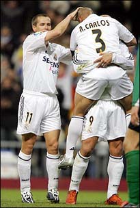 Midfielder Edu pulled one back for the visitors with a sharp strike on the turn early in the second half, but centre back Ivan Helguera snuffed out any hopes of a comeback when he looped a header over keeper Antonio Doblas two minutes later. Barcelona, who were held to a 0-0 draw at home by city rivals Espanyol on Tuesday, lead the standings with 59 points, Real follow on 53, a distant 10 ahead of in-form Villarreal. Manuel Pelligrini's side climbed into third thanks to a 2-1 win at home to relegation-threatened Real Mallorca, Uruguayan striker Diego Forlan snatching a late winner to take his tally for the season to 16. Earlier Sevilla and Valencia fought out a dramatic 2-2 draw that kept the teams in the hunt for the Champions League places. Sevilla striker Julio Baptista, who had equalised when he cracked home a penalty midway through the second half, missed a golden opportunity to seal victory when he skied another spot kick over the bar just six minutes from time. Valencia, who got off to a winning start under new coach Antonio Lopez with a 2-1 victory over Betis at the weekend, were also left ruing their bad luck when they had a late goal controversially disallowed for a foul. The result left Sevilla fourth in the standings, level on points with Villarreal and one ahead of champions Valencia. Visitors Betis should have taken the lead in the second minute at the Bernabeu when winger Joaquin danced through the Real defence but then dinked a weak lob straight into the hands of keeper Iker Casillas. Nine minutes later England striker Owen squirmed his way past two defenders to poke the ball under Doblas after Santiago Solari had cut a pass into the area. TOP-DRAWER SAVES Casillas made several top-drawer saves to keep the dominant Andalucians at bay, before being forced to leave the pitch with what appeared to be a groin injury early in the second half. The pressure was relieved on Real, though, when the referee awarded them a controversial free kick 10 metres out from the goal after defender Luis Fernandez was adjudged to have given a back-pass to keeper Esteban just before the break. Roberto Carlos celebrated his 300th league appearance for Real by firing an unstoppable thunderbolt high into the net. Owen spurned two good chances to extend Real's lead after the break, slicing one shot over the bar and then scuffing a follow up into the arms of the keeper. Betis looked as though they might stage a comeback when Edu stepped round two defenders to fire home past reserve keeper Cesar, but Helguera destroyed their hopes when he restored his side's advantage two minutes later. The home crowd were unsatisfied, however, and Ronaldo was greeted with a chorus of jeers when he failed to convert several late chances to extend Real's lead.