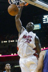 Miami Heat's Shaquille O'Neal (32) scores as Milwaukee Bucks' Desmond Mason, left, watches, in the second quarter Monday, March 14, 2005 in Miami. [AP]