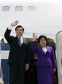 President Hu Jintao and wife Liu Yongqing waves farewell at the Manila Airport, April 28, 2005. [Xinhua]