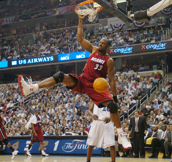front of Washington Wizards' Larry Hughes (obscured) while Miami coach