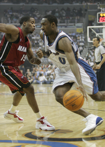 past Miami Heat's Damon Jones during first half of Game 3 in the NBA