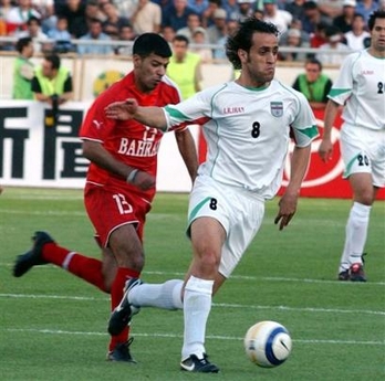 Iranian national soccer team player Ali Karimi, right, and Bahrain's national soccer team player Talal Yusuf Mohamed in action during the Iran and Bahrain Asian World Cup qualifying for the 2006 World Cup in Tehran, Iran Wednesday June 8, 2005. [AP]