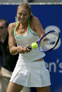 Sharapova, who won this tournament last year en route to her Wimbledon title, said she enjoyed being back on grass. "I tried to hit as freely as possible, even if it meant a few mistakes," Sharapova said. "That's just the way I am going to play. I am not going just to put the ball back to her, I am going to hit the ball hard and be in control. "I like the pace of the ball," she added. "I get a good advantage, especially with my height and serve. It's a very different game from last week ( French Open) and I like it." Third-seeded Jelena Jankovic also advanced to the third round, beating Sania Mirza 6-1, 7-5, and 10th-seeded Nicole Vaidisova topped Stephanie Cohen-Aloro 6-3, 6-2. No. 14 Lisa Raymond was upset 6-1, 6-0 by Milagros Sequera.