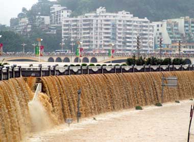 Floodwater, like waterfalls, rushes into a district of Wuzhou,