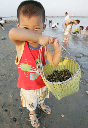 A boy collects shellfish on the beach of the Qiantang River in Hangzhou, East China's Zhejiang Province July 3, 2005. Water level of the river drops substantially due to a lack of rain and high temperature in recent days. [newsphoto]