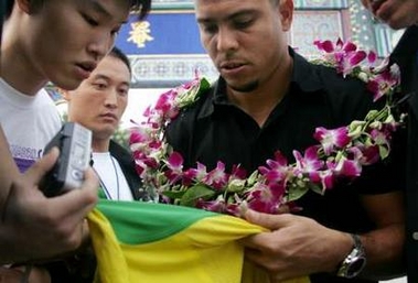 Brazil's soccer player Ronaldo (C) of Real Madrid signs his autograph for Chinese fans during a welcome ceremony at Xianghe town in Hebei Province, eastern Beijing July 20, 2005. Real Madrid starts a four-day tour to China on Wednesday and will face Beijing Guoan in a friendly match at Beijing Workers's Stadium on Saturday. [Reuters]