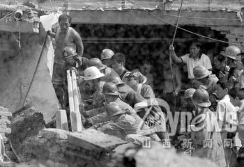 Rescuers search the explosion debris for victims and surviors in a Taiyuan park, Shanxi Province July 21, 2005. The huge explosion in a park in Taiyuan, north China's Shanxi Province killed one 8-year-old girl and injured 33 others July 21, 2005. At about 14:10, the explosion occurred at a two-storey building in the park which is frequented by children, particularly during school breaks. The cause of the explosion is unknown and under investigation. [daynews.com.cn]