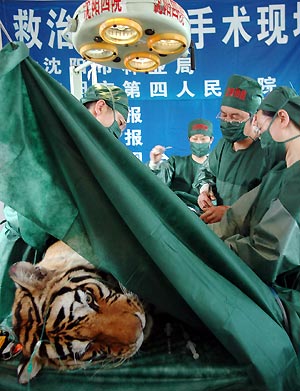 Doctors operate on a tiger to remove three tumors from its body in the Fourth People's Hospital in Shenyang, Northeast China's Liaoning Province July 25, 2005. The two-hour surgery on this 3-year-old male tiger was successful. [newsphoto]