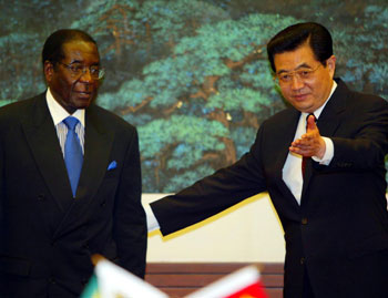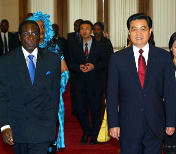 President Hu Jintao (R) gestures while welcoming visiting Zimbabwean President Robert Mugabe July 26, 2005 in Beijing. [newsphoto]