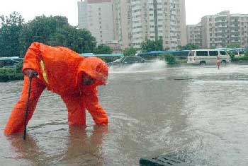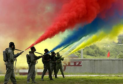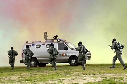 Chinese police officers take part in a security drill in Nanjing, capital of east China's Jiangsu province August 21, 2005. The drill is part of activities to welcome a delegation from the Singapore Police Force, headed by its commissioner Khoo Boon Hui, local media reported. [newsphoto]