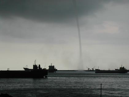 A tornado occurs off the waters of the Oujiang city, East China's Zhejiang Province, August 28, 2005. The tornado lasts for five minutes before it ebbs away. [newsphoto]