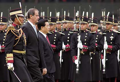 Mexican President Vicente Fox (C) and China's President Hu Jintao review an honour guard during Hu Jintao's official welcoming ceremony in Mexico City's Campo Marte military parade ground September 12, 2005. [Reuters]