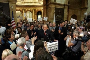 The vote means Massachusetts will remain the only state in the nation to allow same-sex couples to wed — for now. A year after lawmakers appeared destined to undo a court order that has allowed thousands of same-sex couples to marry since May 17, 2004, the Legislature voted 157-39 against the proposed constitutional amendment Wednesday. Lawmakers were required to approve it in two consecutive sessions before the proposal could move to the statewide ballot in 2006 for a final decision by voters. The measure, which would have allowed Vermont-style civil unions, won passage by a 105-92 last year. But the political and social landscape had changed dramatically since then. Gone was the intensity, the seemingly endless debate and, in some quarters, the taste for stripping away the right to marry for gay and lesbian couples. "Gay marriage has begun, and life has not changed for the citizens of the commonwealth, with the exception of those who can now marry," said state Sen. Brian Lees, a Republican who had been a co-sponsor of the amendment. "This amendment which was an appropriate measure or compromise a year ago, is no longer, I feel, a compromise today." The moment the vote was announced, cheers erupted from the gay marriage supporters who watched the proceedings from the House chamber's public gallery. "We have a lot of work ahead of us, but today we celebrate," Democrat Sen. Jarrett Barrios, an openly gay lawmaker, told the cheering crowd. The proposal also was opposed by critics of gay marriage, who want to push for a more restrictive amendment that would ban both gay marriage and civil unions. The earliest that initiative could end up on the ballot is 2008. "We're excited. We're pumped. This is great. This is exactly what we wanted," said Kris Mineau, president of the Massachusetts Family Institute. The state's highest court ruled in November 2003 that same-sex couples had a right under the state constitution to marry. Now, more than 6,100 couples gay and lesbian couples have been wed in Massachusetts, though officials have barred out-of-state couples from getting married here. Within a year of the first Massachusetts marriages, 11 states pushed through constitutional amendments banning gay marriage, joining six others that had done so earlier. The Connecticut Legislature approved civil unions in April, joining Vermont in creating the designation that creates the same legal rights as marriage without calling it such. Earlier this month, California lawmakers passed a measure legalizing same-sex marriage, though Gov. Arnold Schwarzenegger has promised to veto it.