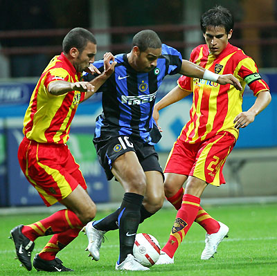 Inter Milan's Adriano (C) tries to dribble past Lecce's Giuseppe Abruzzese (L) and Cristian Ledesma (R) during their Italian Serie A soccer match at the San Siro Stadium in Milan, northern Italy, September 17, 2005. [Reuters]