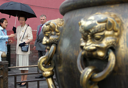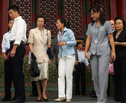 Britain's Princess Anne, escorted by a Chinese interpreter, visits the Forbidden City in Beijing September 20, 2005. Princess Anne is in China from September 20-24 to strengthen relationships between Beijing and London as they both prepare to host the Olympic Games in 2008 and 2012, and to see the work of Save the Children programme in China. [Reuters]