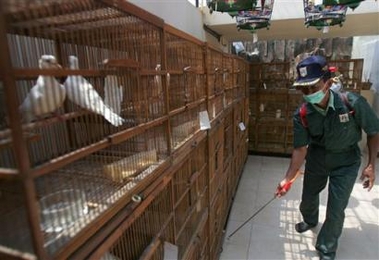 An Agriculture Ministry worker sprays disinfectant at cages at a bird farm in Jakarta, Indonesia, Monday, Sept. 26, 2005. Indonesia's death toll from bird flu has risen to six and the government has ordered more than a half-million tablets of anti-viral medicine to fight the disease, the Health Ministry announced Monday. [AP]