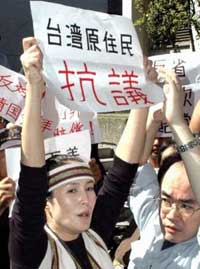 mental anguish. The sign reads 'Aboriginal Taiwanese protest'.
