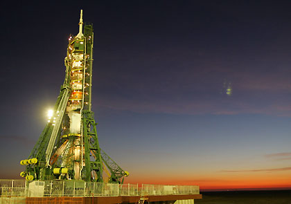 launch pad at the Baikonur cosmodrome in Kazakhstan pre-dawn October 1, 2005.