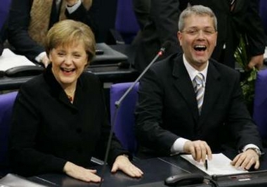 Chancellor-elect Angela Merkel (L) laughs while sitting next to CDU party
