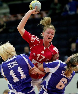 Denmark's Lene Thomsen (C) shoots to score past Ukraine's Olena Reznir (L)