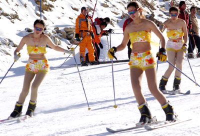 Professional women skiing performers, in bikini,demonstrate skiing skills at a ski resort in Jinan, east China's Shandong Province December 17, 2005. The temperature then was 5 degrees centigrade below zero. The activity was organized by the ski resort to attract customers. These performers come from Harbin, northeast China's Heilongjiang Province.[newsphoto]
