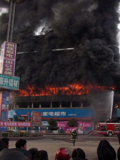 A huge fire engulfs an electronic appliance supermarket in Xinhua County, Central China's Hunan Province December 18, 2005. No deaths or injuries were reported. [newsphoto]