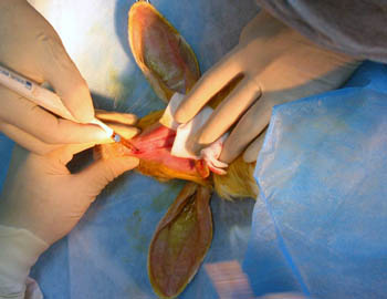 operating on a gray rabbit to transplant half the face of a white rabbit