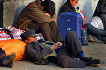 Mirgrant workers take a nap at a train station in Nanjing, East China's Jiangsu Province December 28, 2005. [newsphoto]