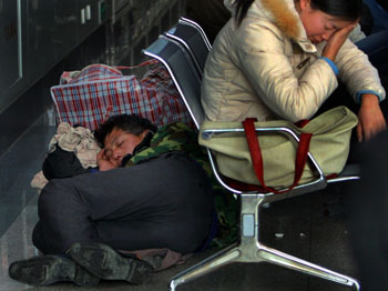 Mirgrant workers take a nap at a train station in Nanjing, East China's Jiangsu Province December 28, 2005. [newsphoto]