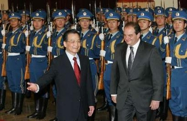 Chinese Premier Wen Jiabao (L) gestures to Greek Prime Minister Kostas Karamanlis during a welcome ceremony inside the Great Hall of the People in Beijing January 19, 2006. Karamanlis is on a four-day visit in China. [Reuters]