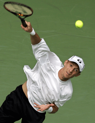 Nikolay Davydenko of Russia serves to Dominik Hrbaty of Slovakia during the Australian Open tennis tournament in Melbourne. [Reuters]