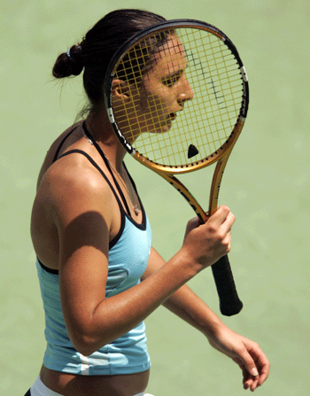 Myskina of Russia walks to the baseline after missing a shot during her match against Schnyder in Melbourne. [Reuters]