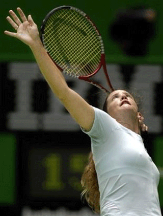 Schnyder of Switzerland serves to Myskina of Russia at the Australian Open tennis tournament in Melbourne. [AP]