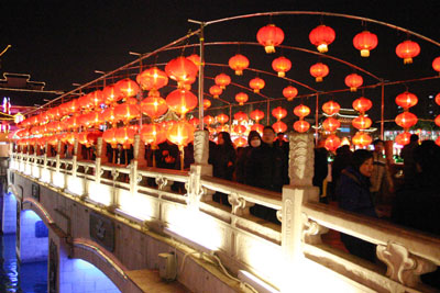 Visitors enjoy the red lanterns on display over a bridge in Nanjing, east China's Jiangsu Province February 9, 2006. Many foreigners in the city joined the locals to buy lanterns for the coming Lantern Festival on the Chinese lunar calendar (February 12 this year). [newsphoto]