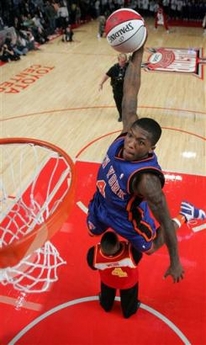 New York Knicks Nate Robinson flies over former Atlanta Braves guard Spud Webb during the slam dunk contest in Houston, Saturday, Feb. 18, 2006. [AP