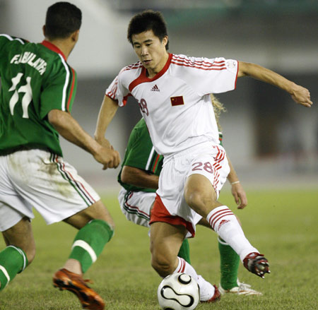 Dong Fangzhuo of China tries to control the ball in a 2007 Asian Cup qualifier in Guangzhou, South China's Guangdong Province February 22, 2006. China won the match 2-0. [Xinhua]