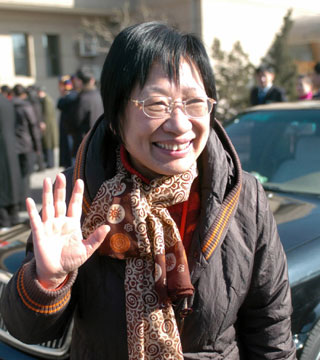 Anhui Province, waves to reporters upon her arrival in Beijing