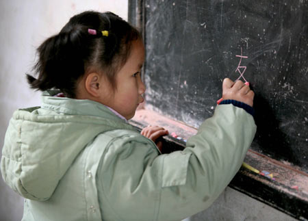 A Chinese girl attends a class at a primary school in China's rural Panghai town, Guizhou Province March 1, 2006. Spending on education is expected to take up a record 4 per cent of China's gross domestic product (GDP) during the coming five years, media report said. [Newsphoto]