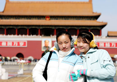 Visitors pose for a picture in the Tian'anmen Square in the center of Beijing March 1, 2006. [Xinhua]