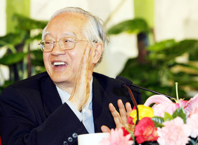 Economist Wu Jinglian, a CPPCC member, answers a question at a press conference on the country's 11th five-year plan in Beijing March 7, 2006. [Xinhua]