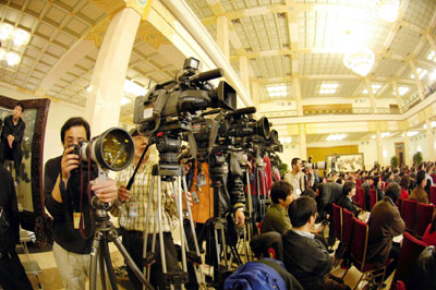 Photojournalists at the press conference hosted by Li Zhaoxing, Chinese foreign minister, in the Great Hall of the People on March 7, 2006. [Xinhua]