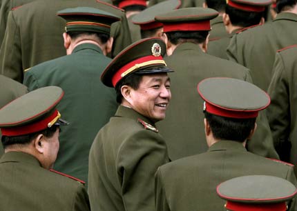 Chinese military delegates arrive at the Great Hall of the People before the National People's Congress session in Beijing March 9, 2006. [Reuters]