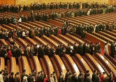 Chinese delegates leave the Great Hall of the People after the National People's Congress session in Beijing March 9, 2006. [Reuters]